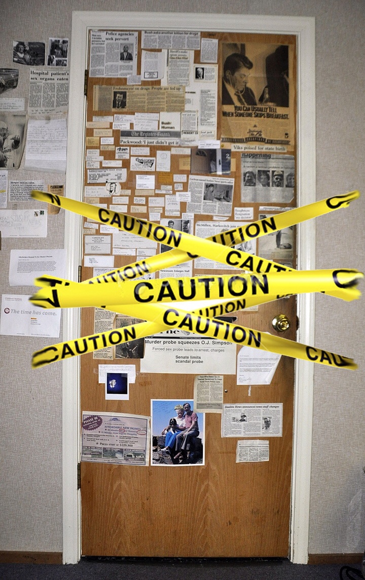 The Door… sentinel of journalistic history and protector of olfactory senses prior to flushing. Do NOT adjust your screen! There is nothing wrong with your computer! Unless, like mine, you’ve actually seen it in a 1980s movie, where it represented the era’s most advanced computer technology as part of a high-tech military defense system that becomes self aware. But assuming you’re looking at a screen smaller than an industrial sized microwave oven, then yes — you really are seeing an image of The Door (of Shame, Blame and Brilliance) in our newsroom.