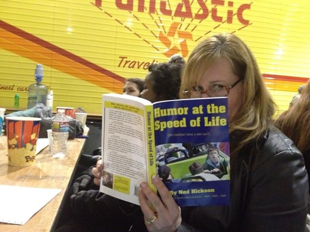 The elite HATSOL (Humor at the Speed of Life) Surveillance Team, utilizing a tiny camera cleverly hidden inside an inconspicuous fake poinsettia, has penetrated the high security that surrounds filming of NBC’s Grimm in Portland, Ore. After several hours and dozens of images of people pointing to the poinsettia with a quizzical expression, this photo of Grimm actress Jennifer Connor reading my book between takes was captured.