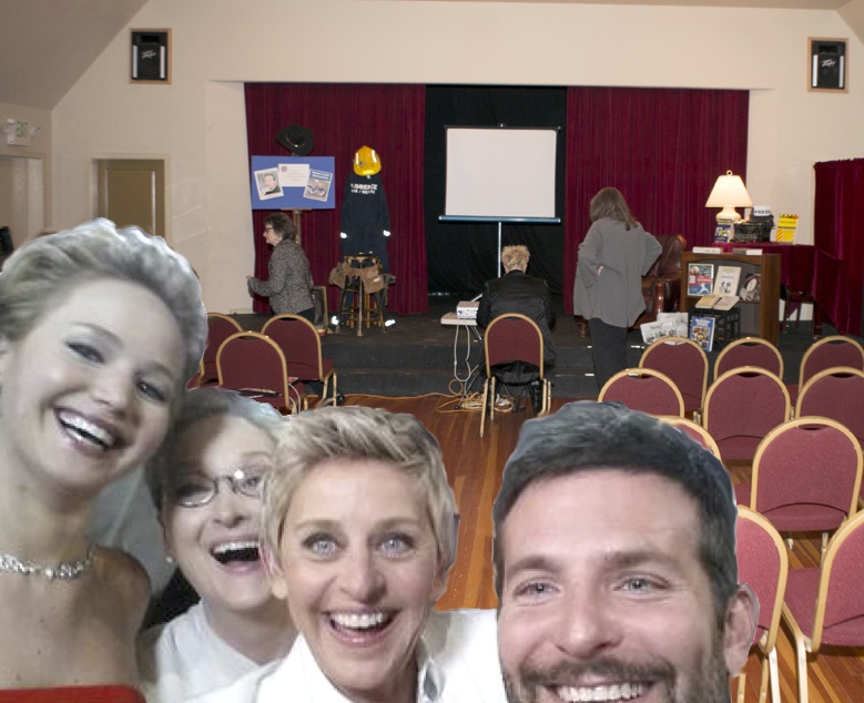 As I mentioned in my NPR interview about the roast, the idea was to avoid a typical book signing, where I’d have to smoke a pipe and wear a tweed jacket with patches on the sleeves. Instead, by holding a roast, the idea was to have fun by letting family, friends, co-workers, readers and people looking for a restroom put me in the hot seat. Word spread quickly thanks to NPR, and the little Florence Playhouse filled up. The bad news was that, once again, Ellen and her friends showed up for a quick selfie while things were being set up…