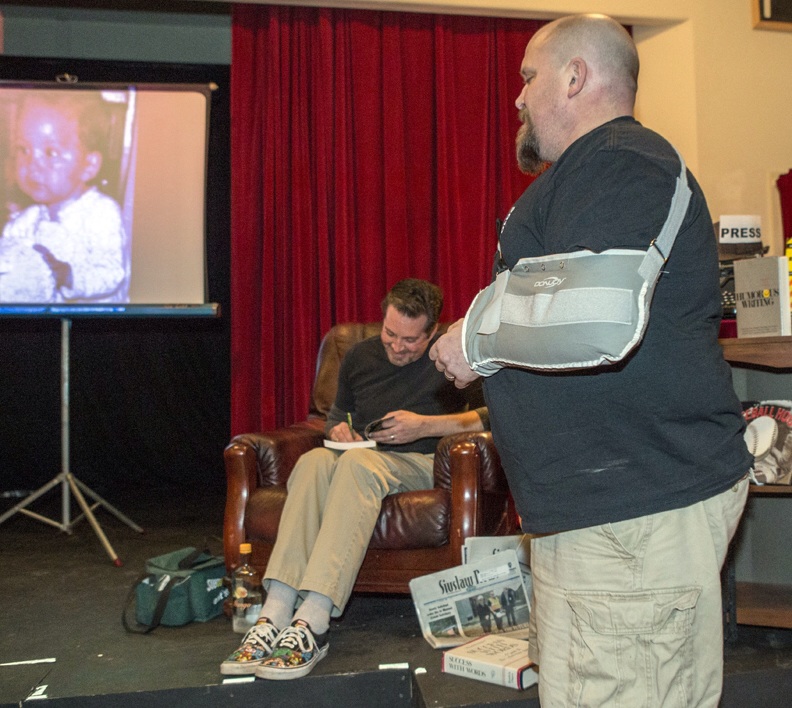 One of the first people to arrive was a reader I met named Bill Olsen. According to Bill, he had been out of town but heard something was happening at the Playhouse about my book. “When I got here and saw all the items on stage, and the pictures from your childhood, I feared the worst,” says Bill. “I thought you were dead.” As I comforted an emotional Bill, he admitted that it was a bitter-sweet relief to see me alive. “On one hand, I’m glad you’re not dead. On the other hand, the copy I have of your book would be worth a lot more.”