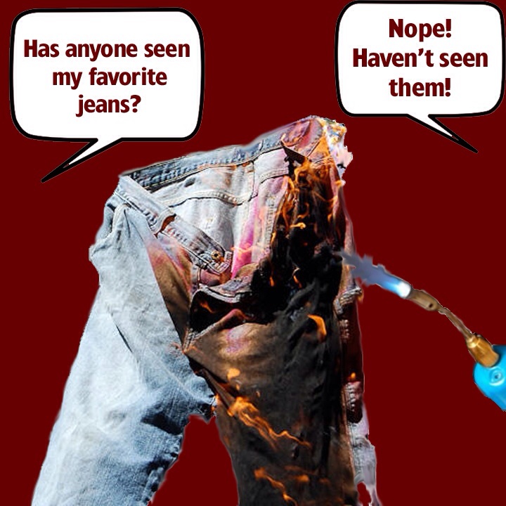 I have a favorite pair of jeans I refuse to give up, and which, over the last few years, my wife has attempted to eradicate on six different occasions. She hates these jeans because, according to her, they are “ripped, frayed and embarrassing.” Particularly when I forget to change them before going out somewhere in public, such as our front yard. Her attempts to get rid of my jeans have escalated from them being “lost,” to an incident last week in which she claimed my jeans “spontaneously combusted,” forcing her to put out the flames with the nearest extinguishing device: A meat cleaver.