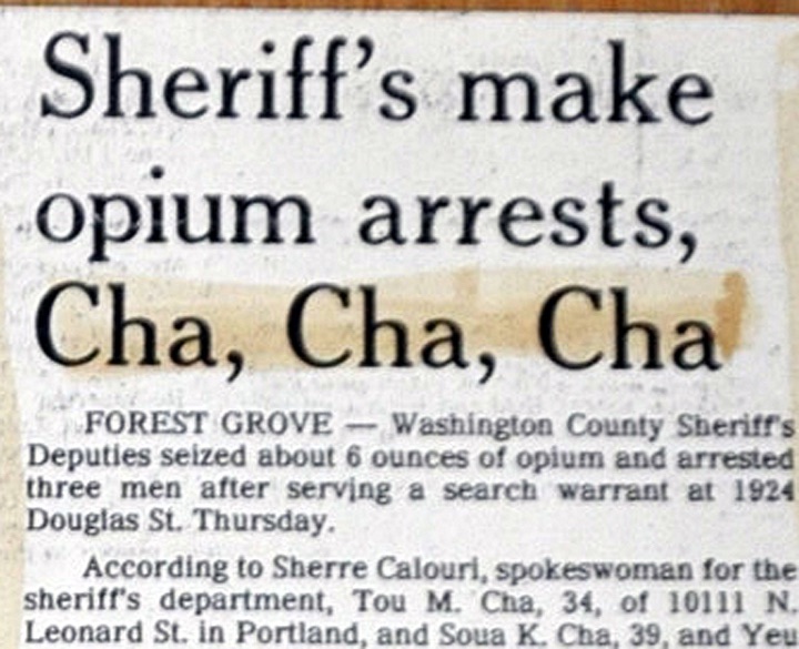 In this case, the editor also recognized the once-in-a-lifetime opportunity the circumstances presented: Police in Forest Grove breaking up a drug ring operated by the three brothers — Tou, Soua and Yeu — who share the last name “Cha.” The headline is true brilliance. Or possibly the result of too much cold medicine.