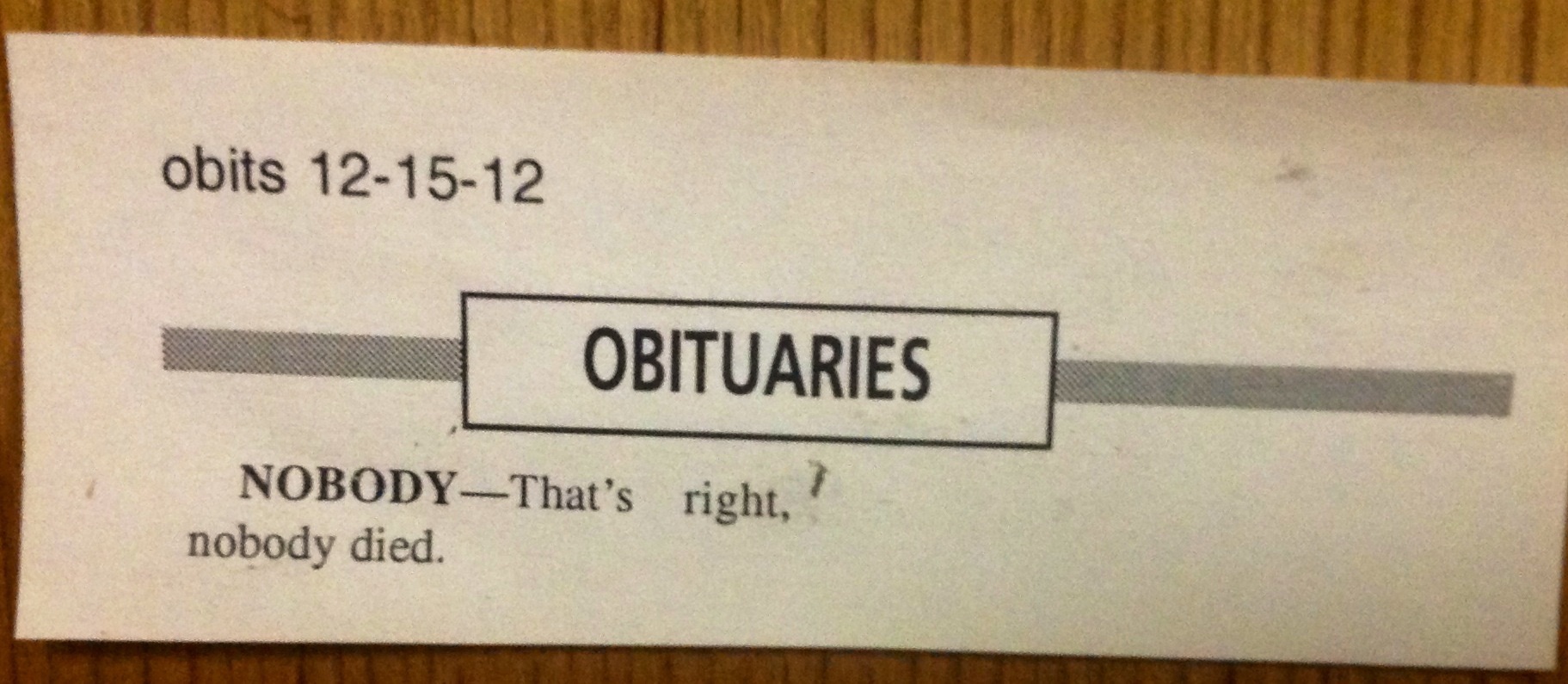 Exhibit A: Below is the work of yours truly. Needless to say, I had some explaining to do. I just thought it was worth noting that, in a town where half of the population is made up of retirees, no one had died since Friday. WOW! Sadly, my editor didn’t share my enthusiasm…