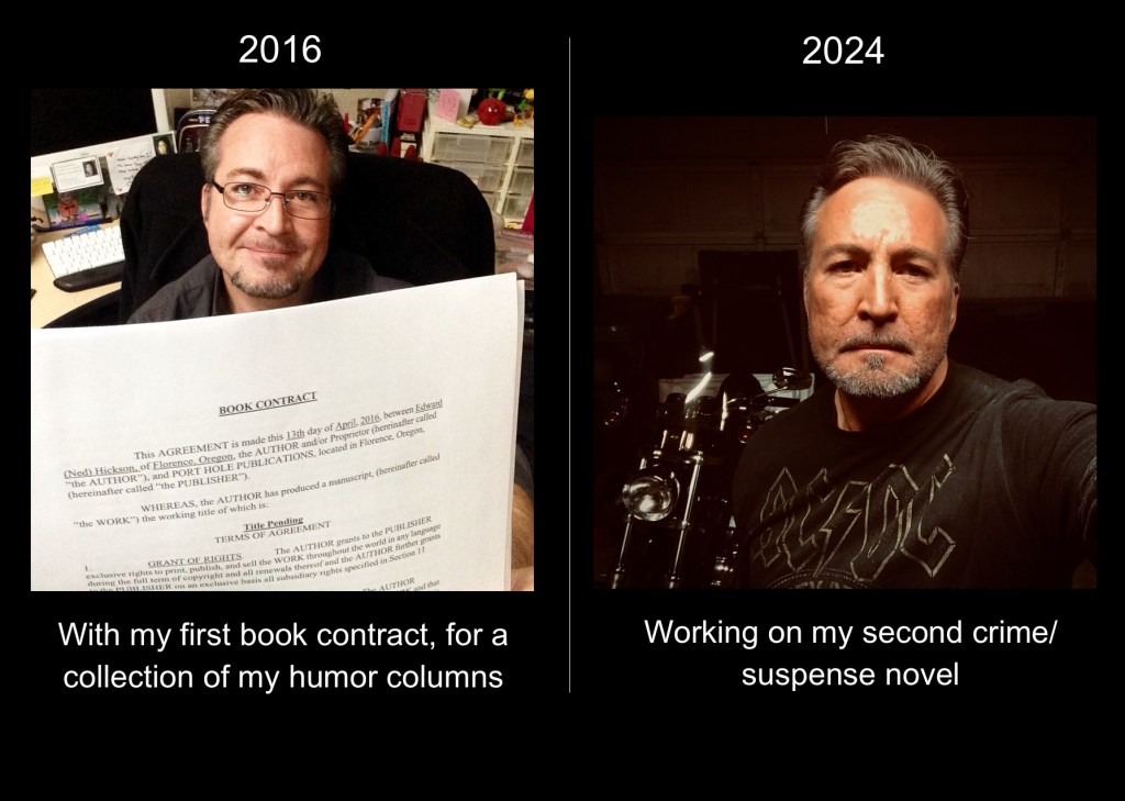 Eight years ago this Monday, I signed my first book contract (above left). It was for a collection of my syndicated humor columns called “Humor at the Speed of Life.” I was still a journalist at the time and had finished a 16-year run of my column in 50 newspapers.